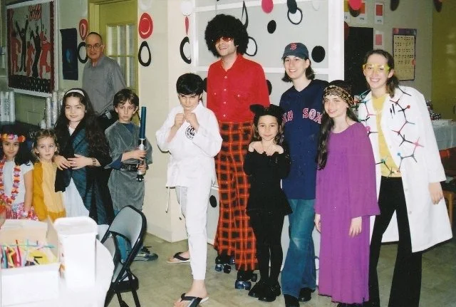 So, this was a fun period in my life because I was hired as the assistant to the Hebrew School, and part of my job was to decorate for Purim. Every year, I created a theme that revolved around the letter “P.” Some of those themes included a pajama party, Persia, purple, and in this year, polka dots and 80’s pop culture. Usually, I spent days making all the decorations myself at home because I wanted it to be a surprise, and I would decorate the synagogue the night before after everyone else went home. In this picture, if you look all the way to your left, you will notice a famous Keith Haring painting that I drew and adapted to the holiday and theme.