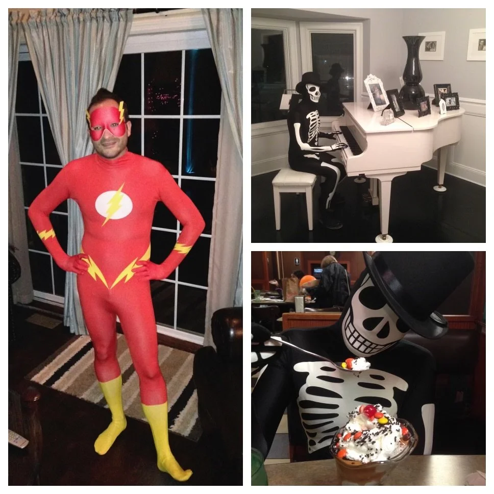 After the event at the theater, we ended up going to Friendly’s for ice cream, and there’s a fun picture of me on your bottom right where I’m planning to eat a Reese’s Pieces Sundae with the skeleton face on because “I was all bones.” I should point out that there was a zipper up the back of the body suit that went all the way to the top of the head, so it was actually very easy to take my head out of the costume without removing the whole thing.
