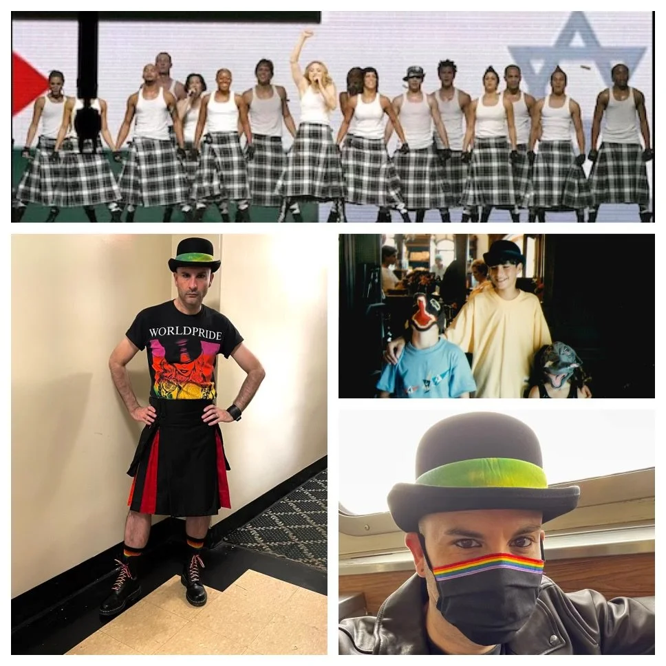 2021: As I mentioned, my 2020 costume was not what I originally wanted to wear. When I started to plot out my outfit that year, I really wanted to do something “international.” I went back and forth about doing something with a kimono, but after watching Madonna’s “Reinvention Tour,” I became obsessed with the kilt costumes she and the dancers wore during Into the Groove and Holiday (see top picture). I started to contemplate “wearing a skirt,” and realized that one thing I had never done was dress in drag, mostly because I don’t think I’d make an attractive woman, and wearing a kilt would probably be the closest I’d ever come to it.