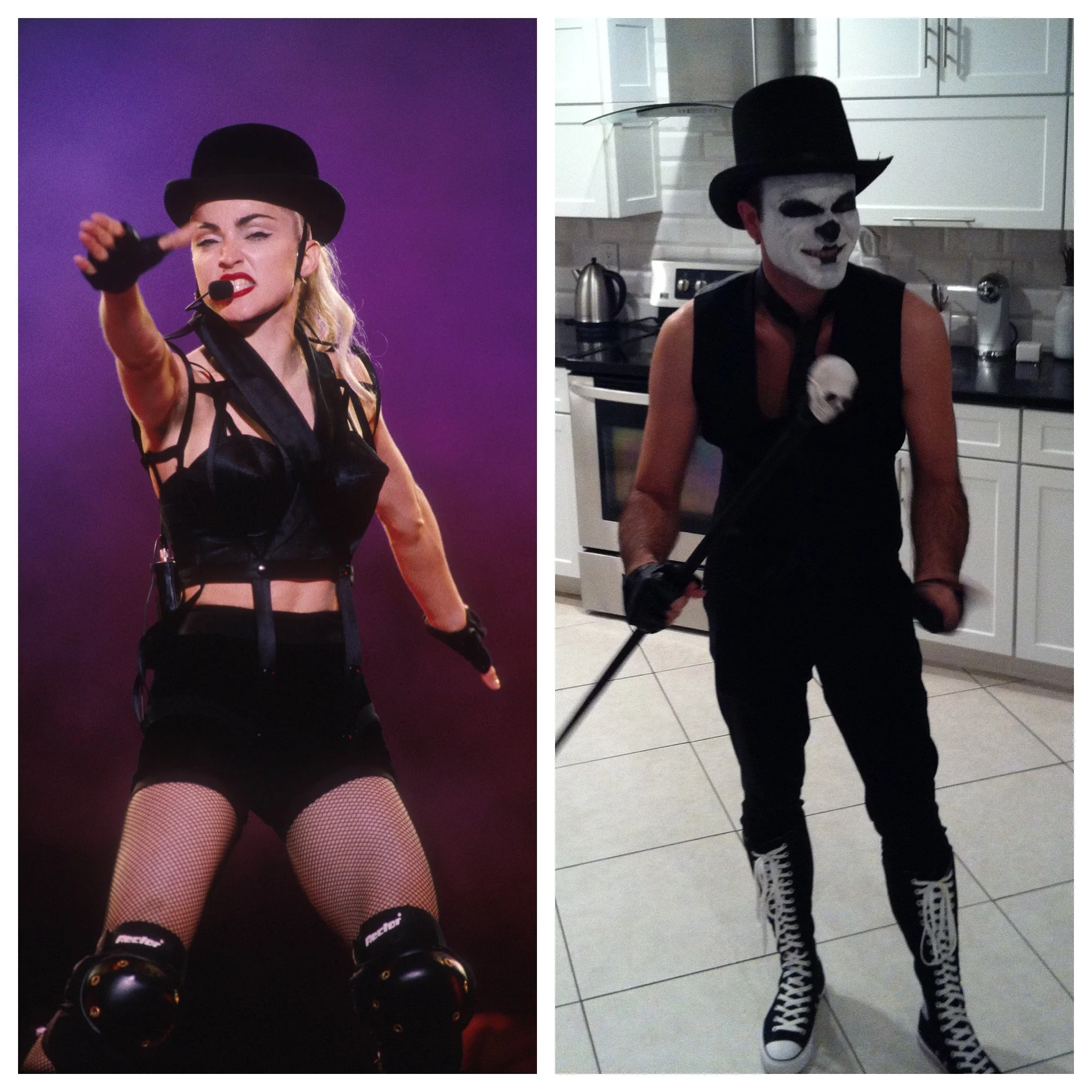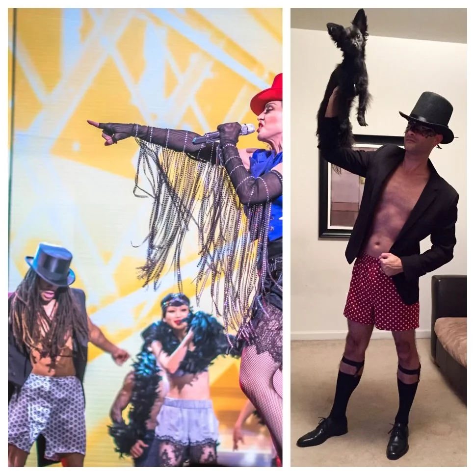 2015: There really is no name for what I dressed up as that year, and I think I may have just said I was a hungover party guest. This was another look that was inspired from a Madonna concert, as you can see from the guy in the background of the picture to your left during her “Rebel Heart Tour.” Please note the same top hat from the previous two pictures.